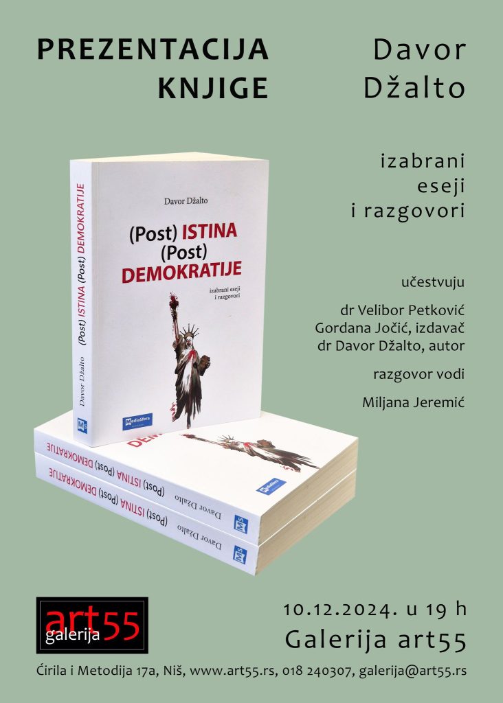 Prezentacija knjige dr Davora Džalta „(Post) istina (post) demokratije“ održaće se u utorak, 10. decembara, u Galerija art55 sa početkom u 19 časova. Učestvuju: dr Velibor […]
